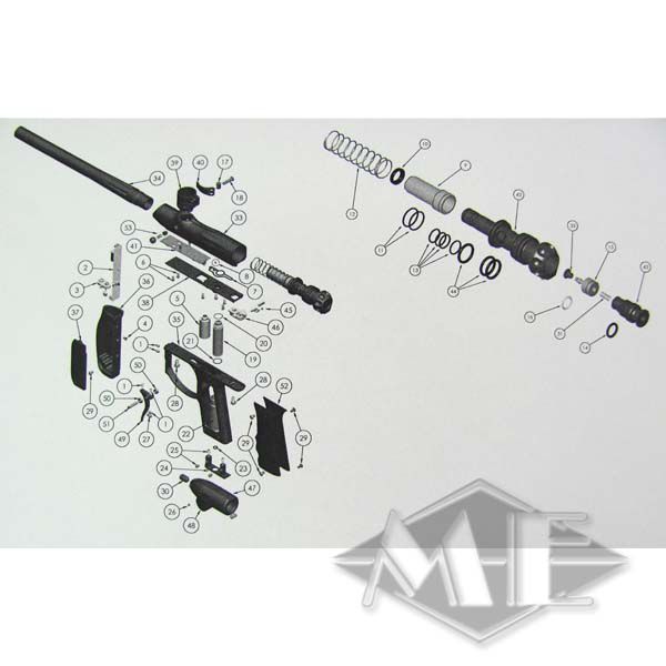 Der kleine O-Ring des Nockengehäuses gehört zur Baugruppe um den Handhebel. In ihm bewegt sich der Pin. Diese Baugruppe sorgt dafür daß der Markierer entlüftet wird wenn der Hebel nach vorne gelegt wird. Wenn der Handhebel nach hinten gelegt wird, ist die Baugruppe dicht und läßt die Luft normal durch den Regulator fließen.